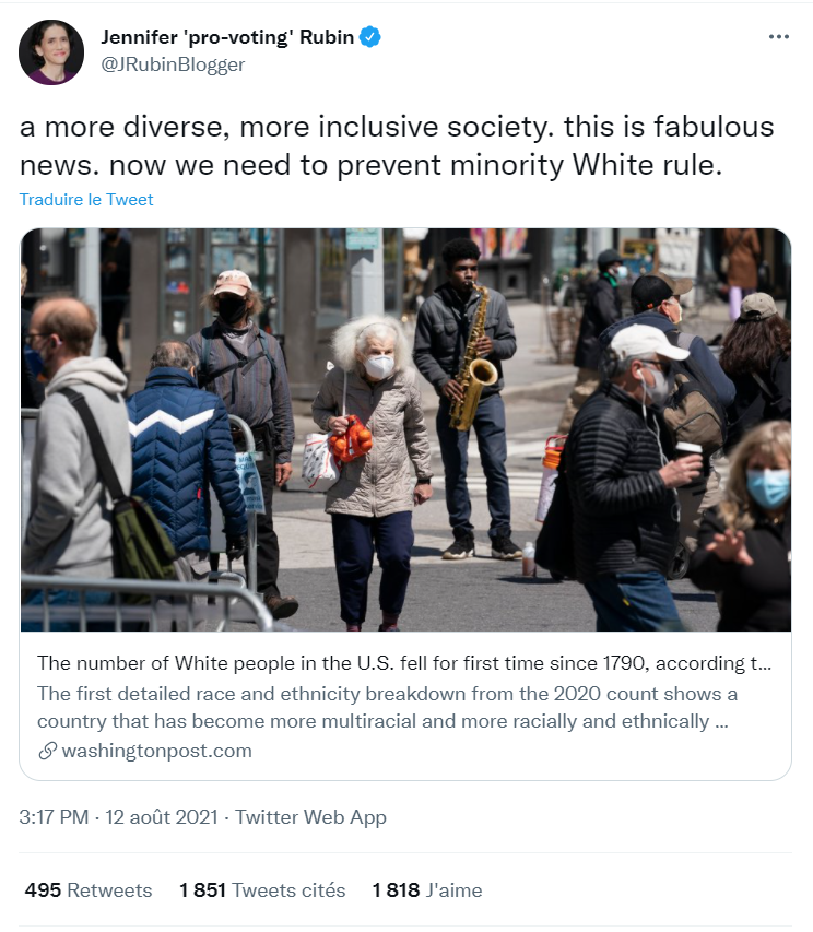 “La nouvelle a été saluée triomphalement par une chroniqueuse du Washington Post (très à gauche, très pro-Biden). La chroniqueuse du Washington Post, Jennifer Rubin, a célébré jeudi la « fabuleuse nouvelle ». « Une société plus diversifiée et plus inclusive », de déclarer Rubin sur Twitter. « C’est une nouvelle fabuleuse. » « Maintenant, nous devons empêcher la domination blanche minoritaire », a-t-elle déclaré. ”