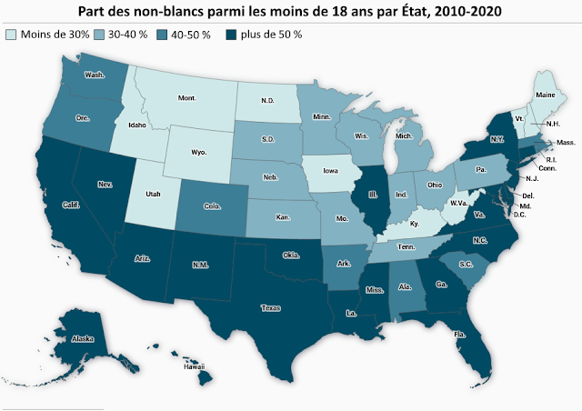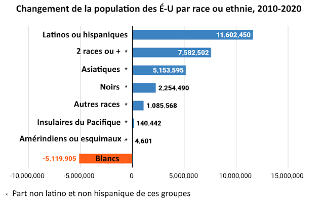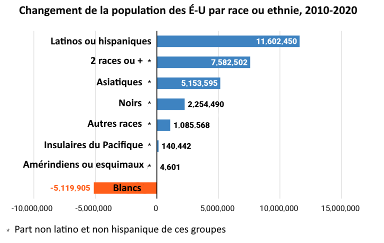 Les premières statistiques raciales et ethniques publiées du recensement américain de 2020 montre clairement que « l’explosion de la diversité » aux États-Unis se poursuit, bien que dans un contexte de croissance nationale plus lente, en particulier chez les jeunes. Les nouveaux chiffres montrent que, pour la première fois, il y a eu une perte absolue (de 2010 à 2020) du nombre d’Américains blancs qui ne s’identifient pas à d’autres groupes ethniques (certains hispaniques sont blancs). Cela signifie que toute la croissance du pays de 2010 à 2020 est attribuable aux minorités — celles qui s’identifient comme latino ou hispanique, noir, Américain d’origine asiatique, hawaïenne ou insulaire du Pacifique, amérindienne ou métisse. Ensemble, ces groupes minoritaires représentent désormais plus de 40 % de la population américaine.