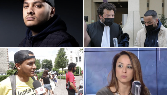 Taha Bouhafs, avec son avocat Arié Alimi (en haut, à droite). La policière syndicaliste Linda Kebbab (en bas. à droite), qui avait porté plainte. image: tweet @Super_Yoyo_fr