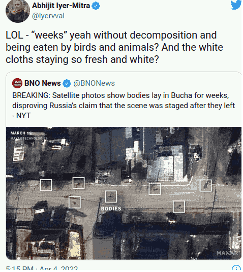 POUR CLARIFIER : Dès le début, le Pentagone a commandé la guerre d’Ukraine. Le Pentagone a ordonné l’utilisation de la population civile ukrainienne comme boucliers humains. Je doute que le Pentagone ait ordonné le meurtre de réfugiés en fuite, mais même l’utilisation de boucliers humains, en particulier lorsqu’ils sont commandés de l’étranger, n’est qu’une nuance de gris par rapport à cela. Les États-Unis peuvent à juste titre être blâmés pour les atrocités commises en Ukraine.