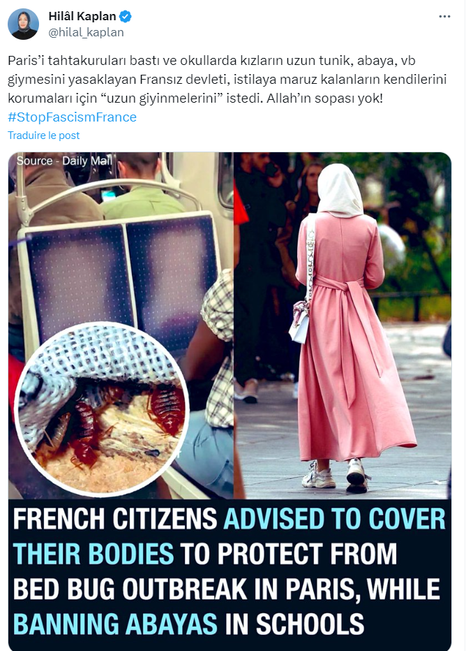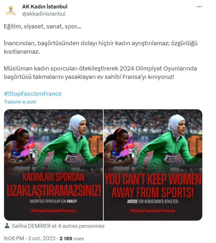 Accueil - Brèves - #StopFascismFrance : le pouvoir turc a orchestré une campagne anti-France en réaction à l’interdiction du voile islamique pour les athlètes françaises aux JO 2024. De nombreux ministres turcs et députés de l’AKP y ont participé