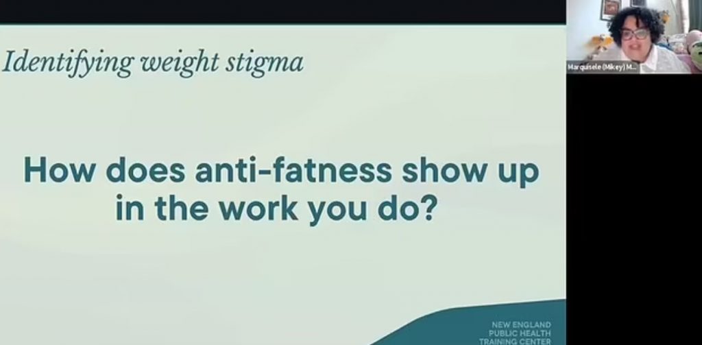 Elle a également animé des présentations sur la manière dont “l’anti-graisses se manifeste dans le travail que vous faites” – ce qui, selon elle, inclut l’utilisation d’un “langage alarmiste afin d’encourager une alimentation saine et une activité physique”.