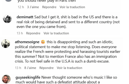 « Aujourd’hui, nous avons pris la décision, immensément difficile, d’annuler notre tournée nord-américaine. Il y a de multiples raisons à cela », explique la Briochine, en anglais dans le texte, à son large public américain. « Le climat politique actuel aux États-Unis, notamment à l’égard de l’immigration et de la liberté d’expression, est très inquiétant. Nous voyageons désormais en famille, avec notre jeune enfant, donc plus que jamais, on a besoin de se sentir en sécurité. De plus, les coûts globaux de cette tournée deviennent difficiles à équilibrer, et cela implique un lourd fardeau financier pour nous », détaille Yelle