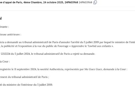 Un livre de l’islam wahhabite interdit aux enfants : la maison d’édition, représentée par Me Guez Guez, conteste cette interdiction, sans succès ; en désignant « les mécréants pour ennemis », l’ouvrage incite à la haine envers les non-musulmans (MàJ)