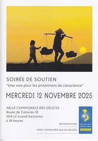 Cette année, comme les années précédentes, avait lieu la soirée de soutien, organisée par le Cosunam, Comité Suisse-Vietnam, à la Salle communale des Délices, au Grand-Saconnex. C'était l'occasion de faire retentir Une voix pour les prisonniers de conscience, emprisonnés au Vietnam.