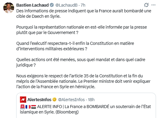 Les forces aériennes britanniques et françaises ont mené une opération conjointe samedi soir pour bombarder une cache d’armes souterraine présumée, précédemment utilisée par le groupe État islamique en Syrie, a déclaré le ministère britannique de la Défense.