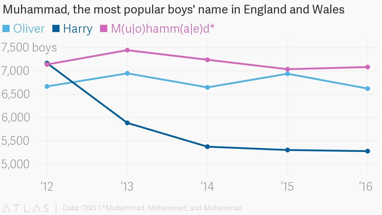 Le Bureau de la Statistique nationale ajoute qu'Oliver "est le prénom le plus populaire pour les garçons depuis 2013". C'est inexact, nous dit Quartz, graphique à l'appui : depuis 2012, les M(u|o)hamm(a|e)d sont devant.