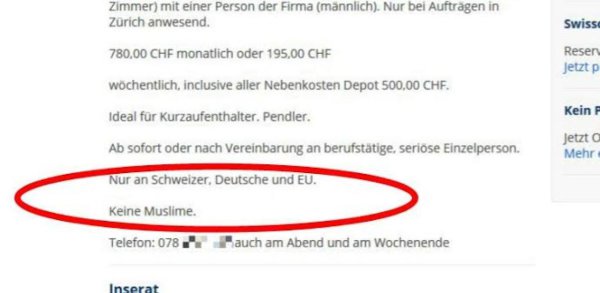 Un propriétaire a récemment proposé sur le portail Immoscout24 un appartement en location de deux pièces à Zurich. En précisant bien «que pour des Suisses ou des citoyens européens, pas de musulmans», comme l'a découvert la «Nordwestschweiz», citée par l'«Aargauer Zeitung».