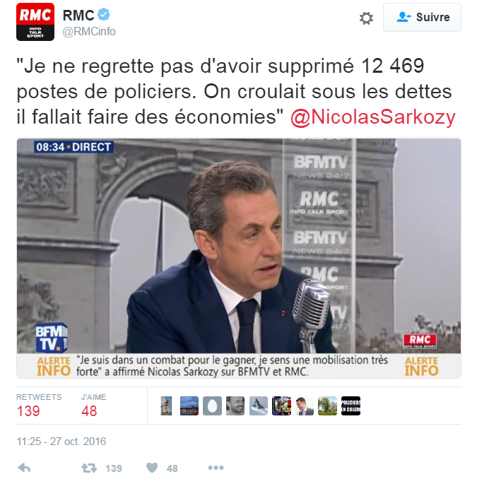 Sarkozy: “Je ne regrette pas d’avoir supprimé 12 469 postes de policiers. On croulait sous les dettes il fallait faire des économies”