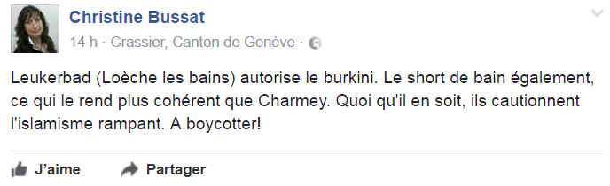 Christine Bussat, fondatrice de la Marche blanche et UDC vaudoise est très suivie sur sa page Facebook et sur celle des Déburqadères. Elle a relayé avec un succès inouï notre post et comptait faire sa petite enquête auprès d’autres établissements. Pas la peine: dans les autres bains thermaux, affirme la directrice, «la manière de faire est presque partout la même.» L’islam des ténèbres a gagné.