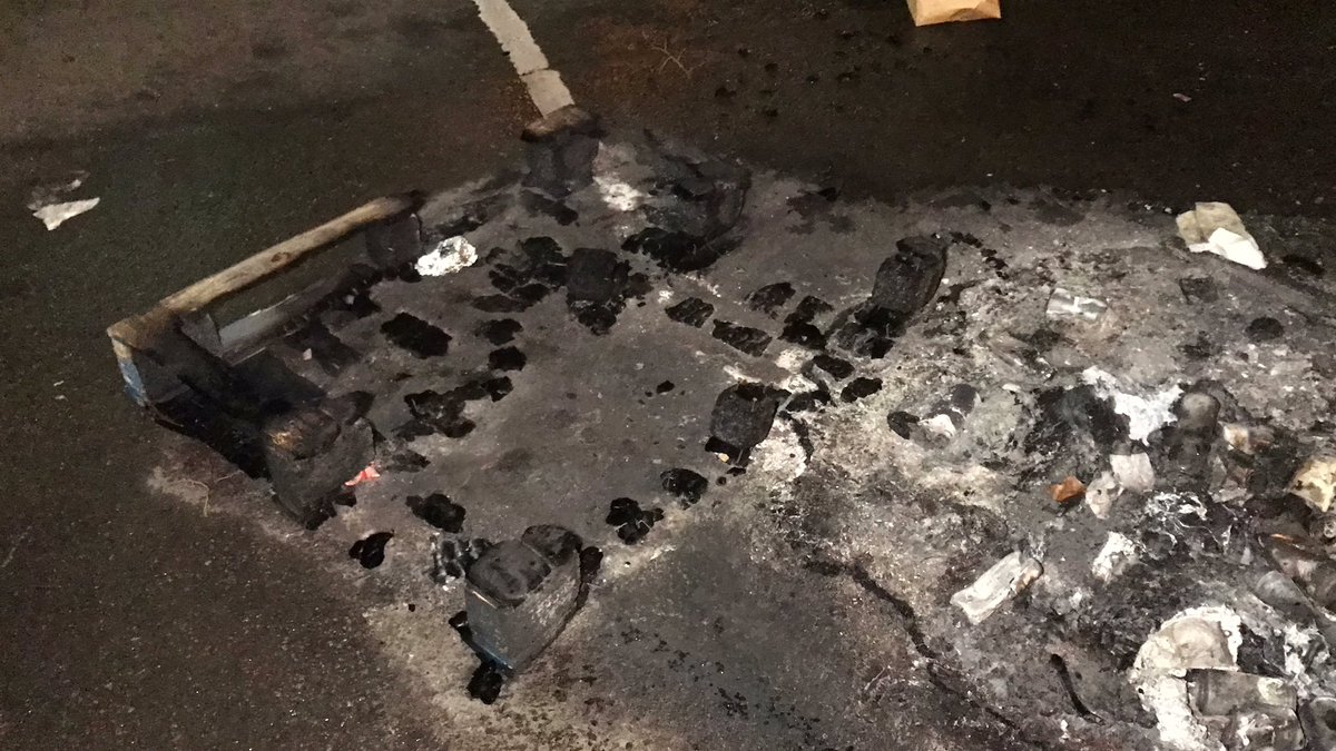 Lorsque la police est arrivée au centre de Hovsjö pour enquêter, des pneus de voiture étaient en feu à proximité. Des déchets et des pneus avaient été mis en travers de la route et on y avait bouté le feu. Les pompiers ont été appelés afin de les éteindre.