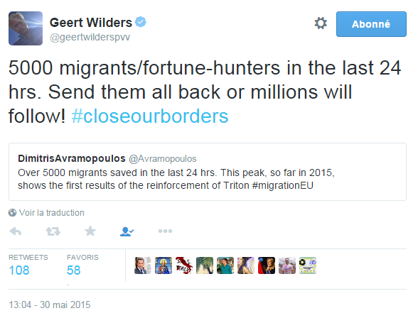 En ce moment même, il y a environ un million d’immigrants, la plupart musulmans, en train d’attendre en Afrique du Nord de pouvoir traverser la Méditerranée dans des bateaux pourris. Ils prennent le risque de se noyer parce qu’ils savent que l’Europe ne les renverra pas une fois qu’ils auront traversé. C’est pourquoi de plus en plus de gens essayent de traverser. Cette situation doit prendre fin.