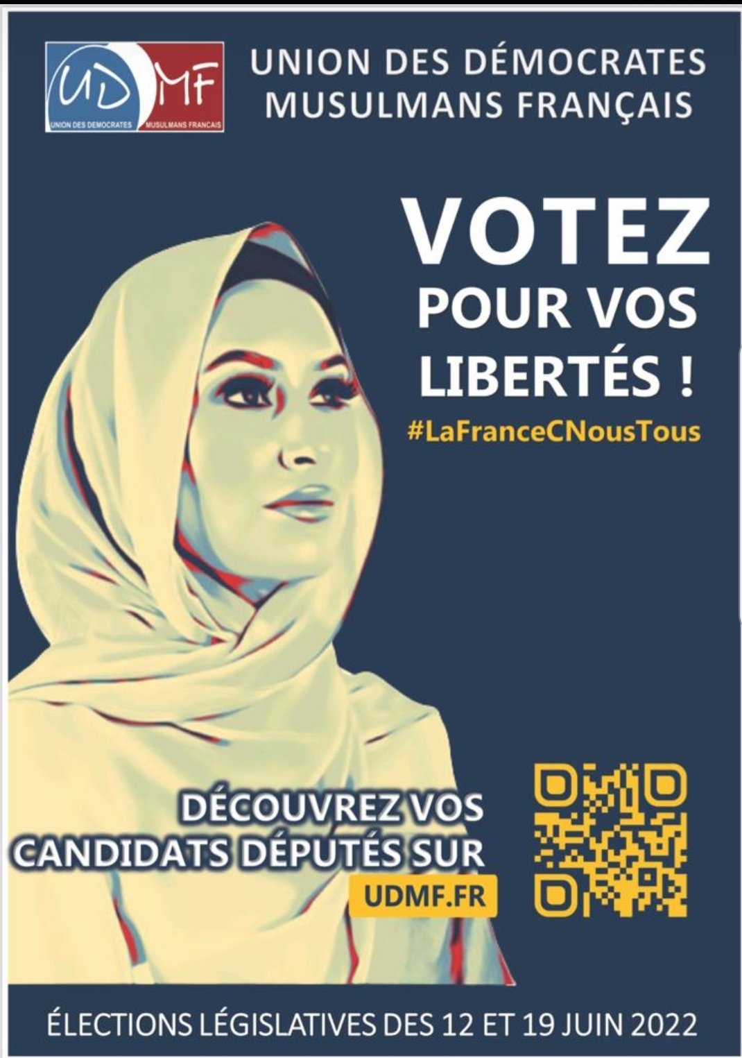 Sur ses affiches législatives de campagne, l’UDMF annonce la couleur : une femme y est représentée avec un hijab, le voile islamique. Le parti se déclare ouvertement islamiste et entend faire de la « lutte contre l’islamophobie et la xénophobie » sa priorité. Le mouvement avait également présenté des candidats aux élections européennes de 2019, aux municipales de 2020, et aux régionales de 2021. Son leader Nagib Azergui avait dénoncé la dissolution par le ministère de l’Intérieur en 2021 de deux associations, le Collectif contre l’Islamophobie en France (CCIF) et BarakaCity, toutes deux également proches de la Confrérie des Frères musulmans.