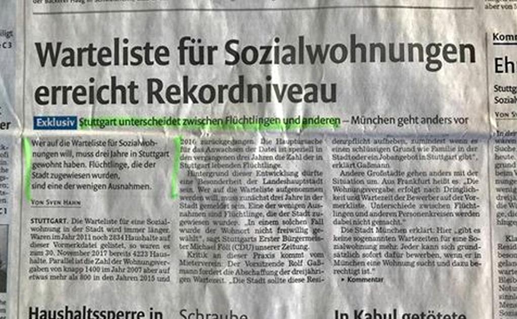 Lors de l'attribution des logements sociaux, Stuttgart fait une distinction entre les réfugiés et les autres personnes. Alors que certains sont immédiatement mis sur la liste d'attente, les autres doivent être déclarés à Stuttgart depuis 3 ans. Résultat: le nombre de réfugiés sur le fichier d'inscription augmente.