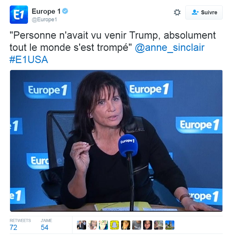 Désormais, comment voulez-vous être crédibles et même audibles, après une telle gamelle ? Alors pour détourner l’attention, vous dédouaner de vos fautes et erreurs professionnelles répétées, en compagnie de vos invités triés sur le volet pour éreinter le camp républicain, vous accusez maintenant les sondages qui ne vous ont pas permis de prédire cette “surprenante” victoire, selon vous bien sûr. De toute façon, il n’y avait qu’à vous écouter, le succès des Républicains n’était pas possible tant Hillary Clinton, si merveilleuse et si admirable à tous points de vue, était déjà installée, selon vos voeux clairement exprimées, dans le bureau ovale de la Maison Blanche, comme si l’élection n’avait pas lieu d’être et était inutile !!!