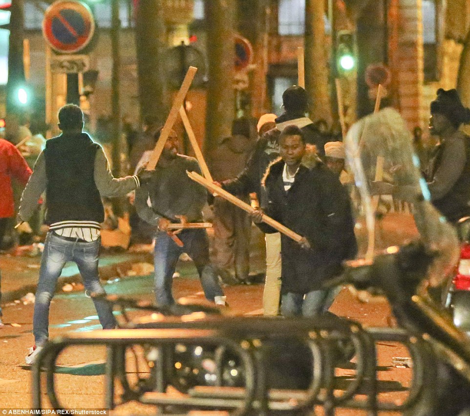 Les photos datant de la nuit dernière montrent des hommes se précipitant les uns contre les autres avec des clubs de fortune près d'une rangée de tentes dans le quartier de Stalingrad à Paris.