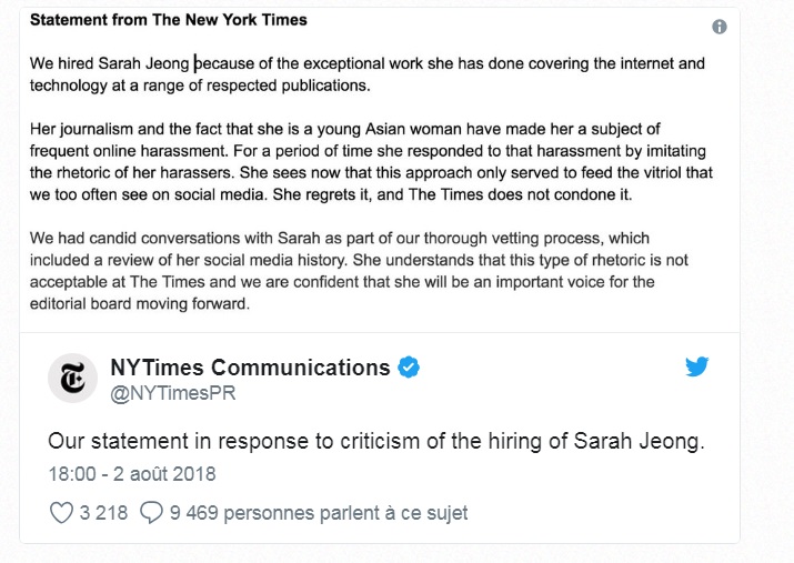 La polémique suscitée autour du recrutement par le New York Times de la journaliste avait poussé le quotidien new-yorkais à réagir rapidement, son équipe de communication ayant en effet souhaité justifier ce choix d'embauche par un texte mettant en avant «le harcèlement en ligne fréquemment subi par Sarah Jeong en raison de son origine asiatique». «Pendant un certain temps, elle a répondu à ce harcèlement en imitant la rhétorique de ses harceleurs [...] Elle le regrette et The Times ne le tolère pas», démine le communiqué, qui précise : «Sarah Jeong comprend désormais quelle rhétorique est acceptable ou pas au New York Times.»