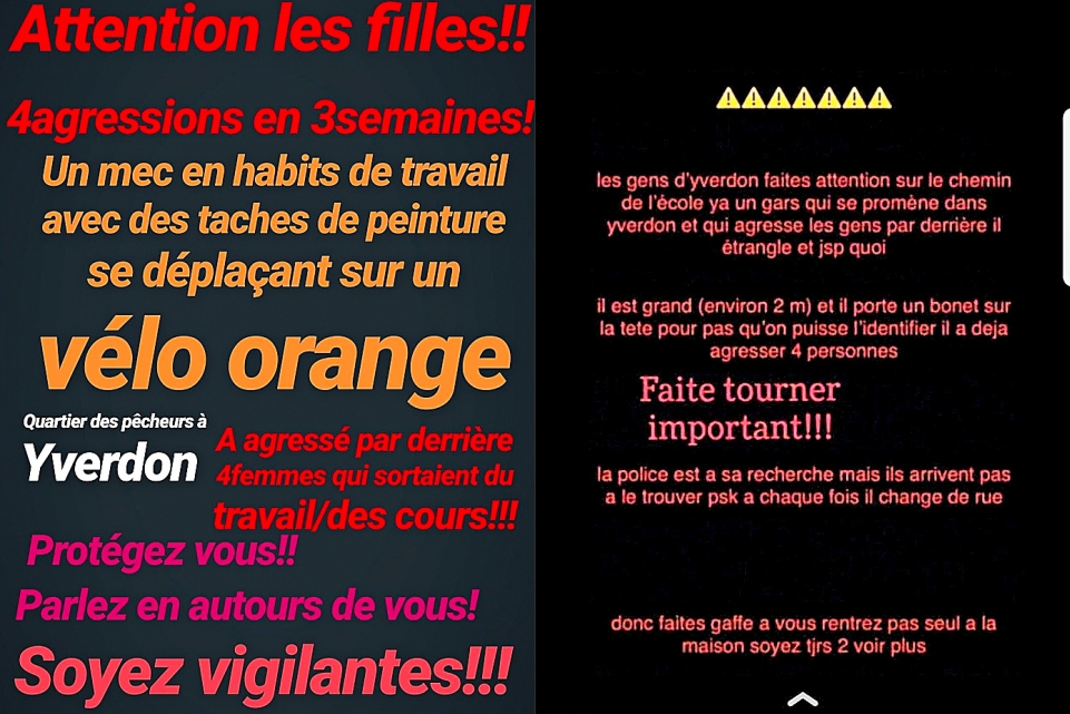 Depuis mercredi, les réseaux sociaux sont en ébullition. Deux messages alarmants circulent abondamment sur Snapchat et sur Facebook, mettant en garde les Yverdonnoises (images ci-contre): «Attention les filles! Quatre agressions en trois semaines!
