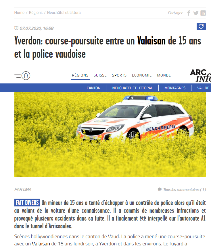 La police a dû prendre en chasse un Irano-Portugais de 15 ans domicilié en Valais. Après avoir traversé toute la ville, il a été intercepté sur l’autoroute A1, direction Payerne.